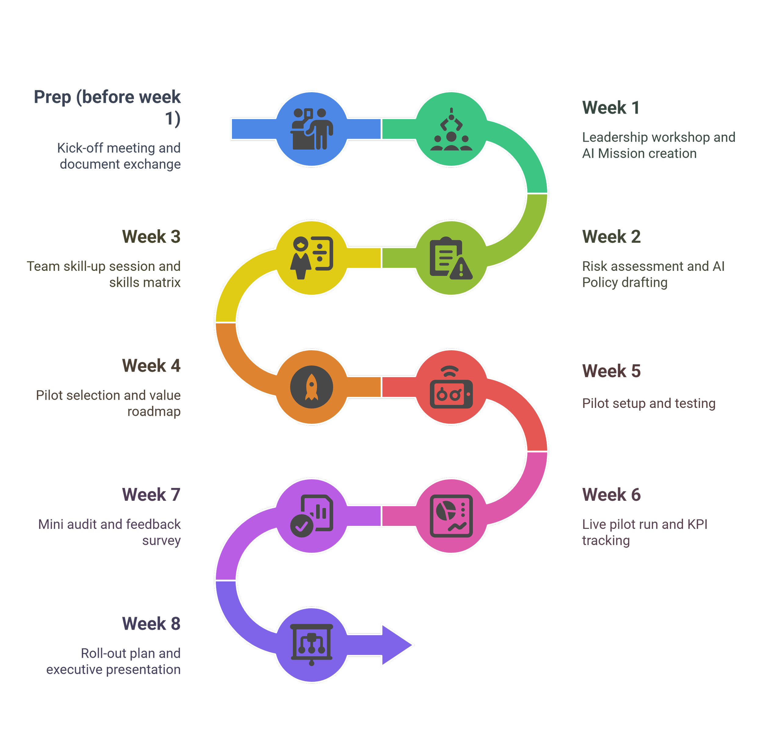 Live pilot in 8 weeks, KPI dashboard, AI policy and risk log, staff training